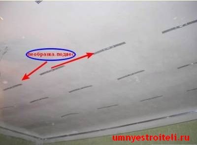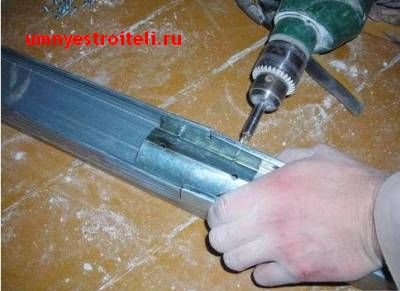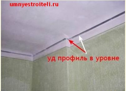 Профиль UD имеет в основном трёхметровую длину. Прикрепив одну полосу, следующую просто вставляем в паз предыдущего и продолжаем крепить как ни в чём не бывало. В переходах по углам, если дошли длинным профилем, просто вымеряем угол, делаем отметку на профиле UD, разрезаем ножницами кромки профиля и сгибаем, смотря какой у нас угол - то ли наружу, то ли вовнутрь. Не забываем прокрепить быстрым монтажом. Если у вас профиль налез на профиль или некрасиво раскрылся в углу, не переживайте, это черновая отделка, то есть должно быть так. Когда наш каркас из УД профиля набран, переходим к набору на потолок пеобразок и самого профиля CD. Набиваем пеобразки и крутим несущий профиль.