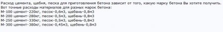 Материал под название сколько нужно цемента на куб бетона, расскажет нам, сколько и какой марки цемента нужно добавлять в куб бетона, чтобы получить бетон марки: 300, 200, 150, 100. Поговорим про то, как посчитать сколько бетона нужно заказать, как рассчитывается бетон. Статья "Сколько нужно цемента на куб бетона", подкреплена интересным видео и фото в тему. И так, дорогие друзья и товарищи, что бы статья сколько нужно цемента на куб бетона не выглядела скудно, немного опишу что мы уже обсуждали похожее в разделе бетонные работы*! Мы рассмотрели много интересных тем, которые нам помогут самим стать подкованными в бетонных работах, что позволит вам сделать самим или проконтролировать процесс, дабы вас не обманули в закладке тех или иных компонентов в бетон, шлака, песка цемента. Просмотрели такие интересные темы как: арматура для фундамента*, вам кстати очень пригодится сейчас расчет фундамента онлайн*, не мало интересного в видео про фундамент*, там собраны все интересные видео про фундамент найденные в интернете и какие расценки на бетонные работы* на данный момент. Ну и конечно, кода вы дольёте свой куб бетона, то вам пригодится статья "Отделка фундамента. Отделка цоколя*". Ну и конечно не стоит забывать про безопасность выполнения бетонных работ**. Продолжим: Сколько нужно положить цемента на один куб бетона? Чуть ниже будет представлена таблица, в которой подробно описано сколько придётся положить цемента различных марок 300, 200, 150, 100 для получения 1 м? бетона марки: 400, 500, 300. Не забываем, что ни один цемент не создаст крепости бетонной смеси если вы не добавите песок, шлак, щебень и не нальёте туда воды. Сколько нужно шлака, гран шлака, песка на куб бетона и конечно сколько нужно цемента. И ещё одна таблица, в которой описано какие пропорции шлака или гран шлака, щебня нужно положить чтобы получить куб бетона (1 м?). Так же будут описаны пропорции цемента, которые стоит применить, дабы получить бетон крепостью 400, 500, 300. Повторение, так сказать, мать учения! Не стоит забывать, что все эти ингредиенты в бетонной смеси, шлак, песок, цемент, на прямую влияют на вязкость и текучесть бетона, а так же на его пластичность. Для усиления крепости бетона и особо не обращая внимание на то, сколько вы положите цемента на куб бетона, не стоит забывать о пластификаторах и присадках, которые сделают бетон мягким и воздушным. Ну а нужное количество бетона для заливки, считается таким образом: длину умножаем на ширину и умножаем на глубину. Полученный результат и будет тем количеством бетона, который вам понадобится. Видео - как экономим цемент на каждом кубе бетона.**Статья «Сколько нужно цемента на куб бетона», подготовлена администрацией сайта Строительства от а до я. Енакиево-Донецк*. Расскажи друзьям о чём читал!
