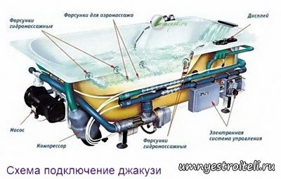 Установка джакузи очень простое занятие, а вот подключение к воде и канализации, а так-же к электросети - НЕТ. Данным материалом Я попытаюсь объяснить, как установить джакузи самому в домашних условиях своими руками + представлю интересное видео в котором дадим советы по правильной установке и подключению. ![]() Как вы понимаете ребята - Установка и подключение джакузи своими руками, это занятие совсем не для простачков! Тут нужно хотя бы пару джакузи подключить прежде чем начинать оказывать такую услугу. Но всё-же если есть здравое желание провести себе установку правильно, стоит основательно под коваться в этом вопросе. Джакузи просто так в розетку не включается! Прежде, чем устанавливать джакузи, подключить его к электричеству и воде, предлагаю взглянуть, из чего оно состоит. Ну и как вам картинка? Причём, это самое минимальное оборудование, которым может быть укомплектовано самое дешевое джакузи. Так что, не выбрасывайте вкладыш по сборке и подключению вашего джакузи, который шел в комплекте с ним! Так как подключаться будите сугубо по нему.