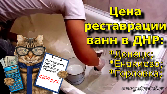 Дабы избежать кривотолков в образовании цен на реставрацию ванн, я хочу донести до ВАС следующее: - На данный момент, в Донецкой народной Республике многие реставраторы предлагают цену, на первый взгляд, ниже чем озвучиваем Мы. Порою можно увидеть стоимость реставрации и 3000 RUB-лей. НО. Ребят!!! Вам стоит помнить, что это минимальная цена за реставрацию, которой попросту ЗАВЛЕКАЮТ клиента. Конечная же стоимость, конкретно по Донецку, остаётся 3700 RUB. Сюда входит приезд, снятие сифона, обработка ванны химией и сам акрил + работа специалиста + устные наставления по дальнейшей эксплуатации и сроку гарантии. НА ЭТОМ ВСЁ. В других городах ДНР цена реставрации растёт согласно удалённости от пункта отправки специалиста. За 1 км. проезда берут 10-12 рублей. То есть в Горловке, Енакиево мы реставрацию чугунной или металлической ванны получаем по цене 4200 RUBлей если нет ржавчины.