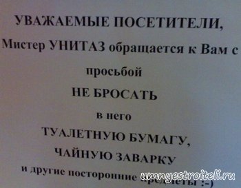 Мне вот даже интересно, а что Вы в унитаз еще что-то выкидываете? Ну вы даете! Зачем вам тогда мусорное ведро? В общем не суть. Сегодня мы говорим о том, что нельзя выбрасывать в унитаз и как отвечает наш сантехник: - В унитаз или в канализацию нельзя выкидывать, выбрасывать ничего кроме ваших естественных отходов организма, немного запахло в воздухе или мне одному так кажется? www.umnyestroiteli.ru Так вот, если вы хотите узнать дозволенность предметов которые можно выкинуть в унитаз, тогда тут вам стоит знать, что забьётся канализация после этого или нет, будет зависеть от вашей канализацинной трубы, а вернее из какого материала она у вас сделана. Если у вас чугунные трубы, то тут даже обычная туалетная бумага может стать причиной потопа, так как забьёт канализацию, а владельцы пластиковой канализации могут по баловать себя и выкидывать в унитаз даже небольшие вещи: носки, трусы, в этом случае будет все зависеть от гусака унитаза. Думаю после такого краткого экскурса, всем стало ясно, что именно нельзя в бросать в унитаз и думаю будет всем интересно, что люди выбрасывают в унитаз. Представлю вам список предметов которые люди выбрасывали в унитаз, которые попали в канализацию и в следствии чего, были от туда еле достать. Список предметов, чаще всего попадающих в унитаз!Первое место занимает конечно же туалетная бумага. На втором месте вещей чаще всего попадающих в унитаз, это бумажные салфетки. Под номером три это чайная заварка, особенно частая проблема в общежитиях. До недавнего времени, пока не вошли в быт автоматические стиральные машины, самыми популярными вещами которые попадали в унитаз были носки. Номер четыре, займут прокладки и тампоны, которые не в зависимости от того, какая труба в туалет, забьют напрочь канализацию. Самые странные штуки которые выбрасывали в толчек, были такие как, бюстгальтер, яблоки, помидоры, огурцы, кости, пластиковые бутылки, разнообразная крупа, которая набухала и становилась такой себе пробкой. Если в квартире есть ребенок, то в унитазе может оказаться все что угодно, начиная от тапочек, игрушек, до мобильных телефонов. Расскажи друзьям о чём читал!