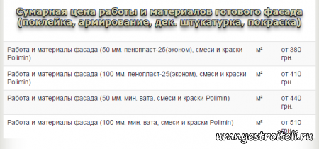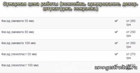 На утепление фасадов цена варьируется в зависимости от нескольких факторов. В первую очередь: цена на прямую зависит от объёмов фасада; второй немаловажный фактор влияющий на цену утепления фасада — чем будет утеплён фасад!! То-ли пенопластом, минеральными плитами и т.д. третий фактор - сложность выполнения работы (вышки,леса,альпинизм);Стоит знать, что цена на утепление фасада возрастает на 20 - 30 UAH. с каждым этажом строения. Эта пляска цен на утепление фасада после второго этажа связана с тем, что нужно будет прибегать к дополнительным спец средствам. Тем более, если это не комплексное утепление фасадов, а точечное. Будет работать высотник или спец. техника*. На этом не заканчиваются фасадные работы* и мы переходим к подготовительным работам, которые проводятся перед утеплением фасада и расчетом цен. В тему: - Цены утепления фасада ПЕНОПЛАСТОМ в ДНР см.тут*. Цена на сборку строительных лесов для утепления фасада. При использовании лесов в комплексном утеплении фасадов, сборка строительных лесов производится по следующим расценкам состоянием на 2020-2021-2022 RUB пролёт. Предприятие берёт с заказчика за сборку строительных лесов для утепления фасадов 200-300 RUB, в зависимости от объёмов, за пролёт. По справедливости и частая практика, строительные леса собираются по 50-75 RUB за элемент конструкции. Аренда строительных лесов составляет 25 RUB погонный метр или квадрат в сутки. Так что выгоднее купить строительные леса, а не брать их в аренду. Цена на на утепление фасада минеральными плитами и пенопластом.Цены на утепление фасадов были собраны относительно средней статистики, по фирмам. Цены на мокрое утепление фасада см.тут*. Наименование работ Ед. измерения Стоимость работ на 2017-2018 год: 1. Утепление фасада пенопласт фасадный м2 -120 UAH; 2. Утепление фасада пенопласт экструдированный м2- 130 UAH; 3. Утепление фасада базальтовая минеральная вата м2- 140 UAH; 5. Изготовление рустов м/п- 85 UAH; 6. Утепление декоративных элементов м/п- 85 UAH; 7. Утепление фасада пенопластом и штукатурка фасада короедом* будет стоить - 280 UAH. м2; 8. Утепление фасада пенопластом и отделка фасада декоративным камнем* то-ли навесным, то ли клееным- 340 UAH.