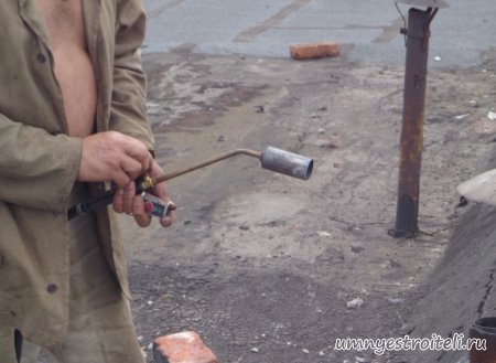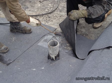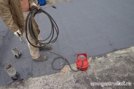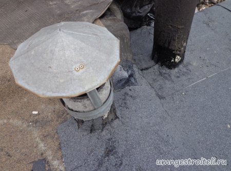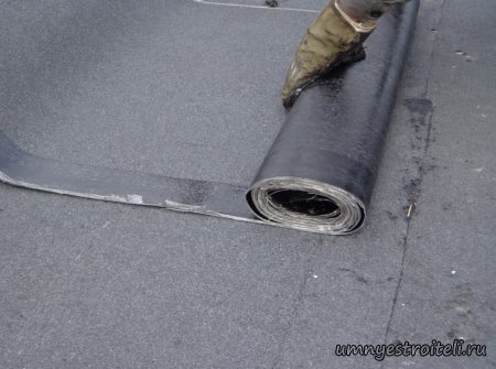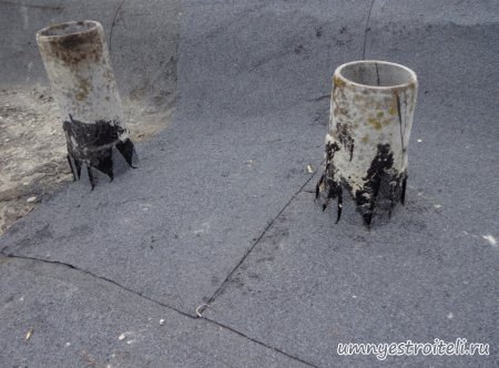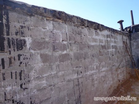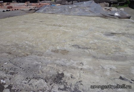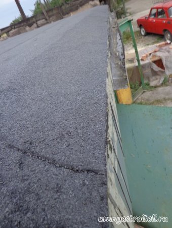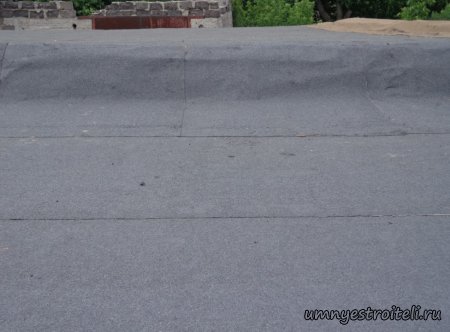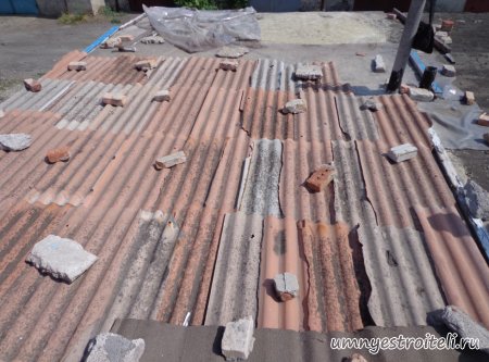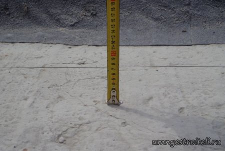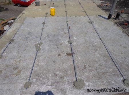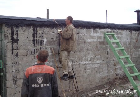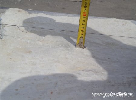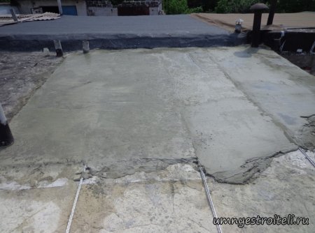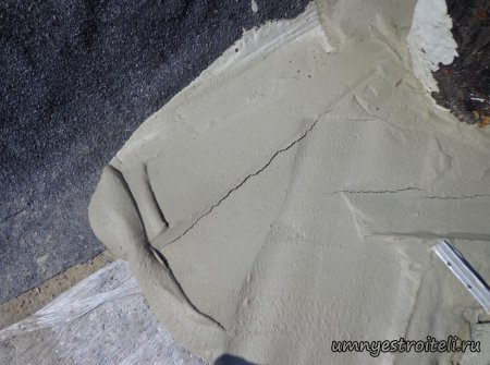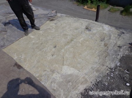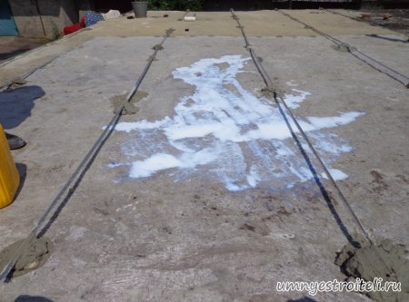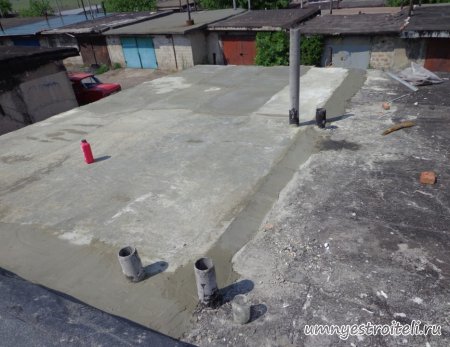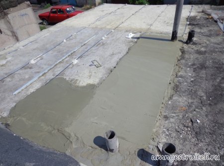 Давайте начнём! Стяжка на крыше гаража.Когда пришли на объект и залезли на крышу гаража, дабы посмотреть фронт работы, мы конечно немного обалдели. Было видно что до нас крышу уже кто-то делал. Спросив у заказчика что это, он ответил что до нас, ему уже её делали, но при первом дожде она протекла. Ну это конечно не удивительно, стяжка которую делали до нас потрескалась напрочь. При взгляде на неё, возникало такое ощущение что цемент в песок не клали вообще. Причём, в той стяжке, был один песок и цемент, с пропорциями 1 к 6. Кощунство чистой воды конечно. Причём за ту проделанную работу, владелец гаража отдал 2.400 UAH.Мы уже говорили не раз, что переделывать дороже будет стоить, чем делать всё нам самостоятельно изначально, но владельца стало по человечески жаль и не глядя на состояние кровли, оговорили сумму в 3000 RUB (не ошибка). Сюда вошло: установка маяков, грунтовка, доставка воды на крышу гаража, замес стяжки вручную. Но для начала, давайте взглянем, что из себя представляла эта крыша гаража без ремонта. Как видим, стяжка треснула буквально вся. От того и протекала крыша гаража как друшляк. Когда стяжка высыхает она должна иметь белый или серый цвет, но не как не желтый. Хотя по краям кровли, видны наплывы серой цементной массы. Что тут горевать и унывать, пора исправлять недочёты. И первым делом нам нужно найти средний ход будущий новой кровли гаража так, что бы она имела уклон. Для этого нам понадобилось забить четыре быстрых монтажа по краям кровли и натянуть капроновую нить от гвоздя к гвоздю. С дальней стороны крыши откуда будет бежать вода выставили в уровень капроновую нить. "Отстреляли" на глаз уклон кровли с одной стороны по минимуму и по передней стороне гаража, где ворота, выставили уровень, задав его при помощи всё той же капронки. По левой стороне нам осталось натянуть капроновую нить по на явности. От увиденных размеров предполагаемой стяжки, был небольшой шок. В некоторых местах её толщина достигала 7 сантиметров. В местах, где слой стяжки был самым жестоким, положили мебельную плёнку из статьи — чем накрыть полы*. Выставили маяки, на алебастр, перемешенный с песком и цементом. Шаг маяков сделали один метр, что принесло дополнительных головных болей. Полтора метровое правило, стоило 800 RUB. Плюнули, будем тянуть профилем. Пришло время грунтовать кровлю. Для этого нам понадобится 20 литров грунтовки глубокого проникновения*. Расход грунтовки* получился просто колоссальным, а всё из за песочной крыши :)). А вот цены на грунтовку* у нас в Енакиево, просто зашкаливают! За 10 литров грунтовки просят 300 RUB. Для того чтобы стяжка не полопалась, было решено скупить по городу сухих стартовых стяжек в размере 30 мешков. Которые, кстати, минимум по 210 RUB. и пол тонны песка, 6 малых мешков цемента. Цемент* стоит 180 RUB за 25 кг. Сам процесс стяжки по маякам, красиво описан в статье — Устройство стяжки по маякам*. Но перед этим проверили смесь на прочность и кое где налили тонким, и толстым слоем предполагаемый раствор для стяжки. Тонкий кстати, кое где полопался, а толстый, повёл себя нормально. Это значит, что в саму смесь нужно добавлять чуть больше цемента. Получается 1 к 3. Начнём лить стяжку. Как видим процесс пошел отлично. Подачу раствора в ведре, на кровлю гаража, организовали при помощи верёвки с крючком. Продолжаем работать. Доведя стяжку, на гараже, до логическ