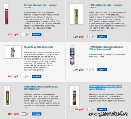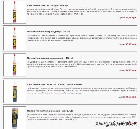 Жидкие гвозди «Момент монтаж» — используются как универсальный клей для разнообразных материалов! Применяют его при ремонте, ремонтно строительных, отделочных и работ по декорированию помещения! Благодаря своим, прямым, способностям к склеиванию, а именно одна нанесенная капля клея жидкие гвозди*, позволяет удержать на стене в вертикальном положении предмет весом в пару десятков килограмм, заслужили своё уважение, как клеевая смесь хорошего качества. Жидкие гвозди фирмы Монтаж, в несколько раз крепче склеивают поверхности, в отличие от бустилат или клея ПВА. При их использовании поверхность не окисляется, не подвергается коррозии, грибкам и т.д. Какой бывает момент монтаж.Модификаций клея жидкие гвозди фирма "Момент монтаж" выпустила очень много. Это и не мудрено, так как нужды у отделочников разные, материалы различны. Весь модельный ряд жидких гвоздей от этого производителя, ну очень не хочется перечислять. Всё что они на выпускали за эти годы вы можете посмотреть на их официальном сайте, а я вам хочу представить те, которые мы наиболее часто пользуемся, так как они отвечают предъявленным требования и заявленной ценовой политике: Titebond Красная туба, картридж — жидкие гвозди по склеиванию металла, пластика, пенопласта. Titebond Желтая туба, картридж — жидкие гвозди монтаж, клеят кирпич, бетон, ДСП, шифер. TYTAN RB-62 Клей для любых Зеркал — жидкие гвозди монтаж которые клеят зеркала к любым поверхностям. Жидкие гвозди Монтаж универсальный — самый распространенный рабочий вариант клея жидкие гвозди монтаж. Вот я вам и представил самые достойные жидкие гвозди от фирмы "Момент монтаж", а теперь вам на фото представлю цены на них. Для РФ: Для Украины: Вот и подошла к концу статья — «Жидкие гвозди момент монтаж». Огромная человеческая просьба дополнять материал, если показался нераскрытым! Видео - что такое жидкие гвозди. Расскажи друзьям о чём читал!