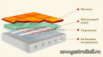 В данном материале Мы рассмотрим, как устанавливается теплый пол под плитку, кафель в подробностях, после чего Вы сами, с легкостью сможете это делать. Подходя к этому вопросу с такой стороны, Вы сэкономите финансовые вложения и позволит избежать ошибок при монтаже теплого пола. Как Мы все знаем, в основном под плитку монтажат водяной и электрический теплый пол. Проще и быстрее конечно плитку положить на водяной теплый пол, просто трубы змейкой уложил на ровную стяжку подготовленную под теплый пол, залил в уровень труб сверху раствором и уложил плитку, но хочется остановится на электрическом теплом полу под плитку. Теплый электрический пол состоит из нагревательного мата, кабеля и терморегулятора. Бывают нагревательные кабеля различных видов, но популярностью пользуются только 2: двужильные и одножильные. Одножильный кабель намного дешевле чем двухжильный, но двухжильный более безопасный. - Заказать монтаж, доставку электрического тёплого пола в Донецке и Макеевке ДНР, вы можете тут*. Монтаж теплого электрического пола под плитку. Первым делом освобождаем помещение от посторонних предметов интерьера, снимаем старое напольное покрытие и подготавливаем поверхность к последующим работам, убираем её. Получив после демонтажных работ неровный пол, выравниваем его при помощи цементной стяжки по маякам (устройство стяжки по маякам), и снова убираем весь строительный мусор. Вам та же пригодится статья стяжка под теплый пол. В стене за ранее подготавливаем место для установки термостата, то ли топим его, то ли, просто прикрепляем на стену по факту. Проводим отдельную проводку для теплого пола и питание для термостата, по возможности от счетчика. В таких вопросах лучше конечно обратится к электрику. Вызов электрика. Далее на стяжку укладываем теплоизоляцию скрепляя между собой скотчем. Утеплитель уже уложен и закреплен по периметру, сверху него укладываем тонкую армирующую стекло сетку и приступаем к монтажу самого кабеля. Немного отступления. В магазинах можно встретить продающуюся в рознь монтажную и нагревательную ленту. Может идти даже в одной коробке но не быть приклеенным друг к другу, что не очень удобно. Лучше конечно-же приобрести уже наклеенную на монтажную ленту нагревательный кабель и продается такое изделие в рулонах.. Монтажная лента теплого пола послужит для избавления кабеля от лишних перегибов и сохраняет одинаковое расстояние между петлями электро кабеля. Если монтажная лента не будет приклеена к ковру, то сам кабель укладывают с промежутками в 20 — 25 см. Не забываем про термо. датчик и правильную его укладку. Обычно его прячут в трубу и заливают той-же стяжкой вместе с кабелем. Инфракрасные полы, монтируемые под плитку, также устанавливаются по такому-же сценарию. И так, кабель уложен, термо. датчик защищен, теперь необходимо проверить на работоспособность все оборудование, ведь ошибок быть не должно! Работоспособность можно поверить при помощи двух простых манипуляций: измерить сопротивление кабеля при помощи тестера или подать напряжение на кабель. Сравниваем полученные показатели с показателями указанными в паспорте изделия. Ну а теперь, с чистой совестью делаем цементную стяжку в 3-4 см, поверх нагревательного кабеля. umnyestroiteli.ru Заливать пол стоит равномерно, без видимых пустот, при появлении и усадке це