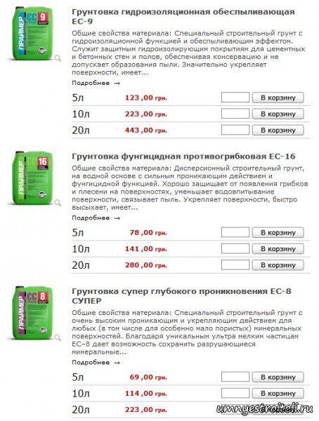 И первой представляю вам статья под названием — Расход грунтовки*. Оговаривалась дисперсионная грунтовка*; При работе с грунтовкой вам по любому нужно знать сколько сохнет грунтовка*. Прошу посетить материал — Хорошая грунтовка*, в котором разбираемся какая грунтовка не просто хорошая, а наилучшая. Прайс лист на грунтовку:Цены на грунтовку актуальны для городов ДНР: Донецк, Горловка, Дебальцево, Докучаевск, Енакиево, Ждановка, Кировское, Макеевка, Снежное, Торез, Углегорс, Харцизск, Шахтёрск, Ясиноватая, Амросиевка, Новоазовск, Старобешево, Тельманово, Шахтёрск. Грунтовка цена ГФ. На фото будет представлена грунтовка гф и цены на неё. Цена грунтовки гф указана в гривнах. Для того чтобы узнать цену на грунтовку в RUBлях, умножаем сумму на три. Для детального рассмотрения цен на грунтовку, нажимаем на фото, оно увеличится. Цена грунтовки церезит. Цена на грунтовку фирмы церезит, представлена за 10 литров. Грунтовка акриловая цена. Акриловая грунтовка* - самая популярная и очень хорошо зарекомендовала себя при отделочных работах. Соответственно и цена на неё слегка превышает остальные виды грунтовок. И так, продолжаем статью и переходим к грунтовке кнауф. Грунтовка от фирмы кнауф. Цена будет представлена на: бетоконтакт, гидроизол, грунт для внутренних работ и т.д. Цена грунтовки глубокого проникновения. **Статья «Грунтовка цена» подготовлена администрацией сайта Строительство от А, до Я. Енакиево-Донецк*. Расскажи друзьям о чём читал!
