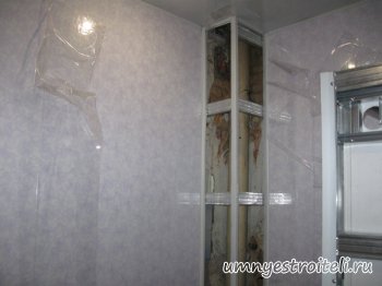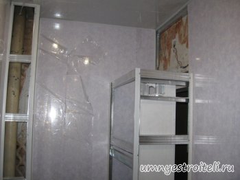 РЕМОНТ ВАННОЙ ПЛАСТИКОВЫМИ ПАНЕЛЯМИ. Вот и подошел к концу ремонт ванной комнаты пластиковыми панелями выполненный нашими отделочниками и я готов его вам представить в полной красе. Плохо конечно что в пятиэтажках ванные небольшие, а то бы мест откуда сделать фотографии, было больше, ну да ладно. В этом недавно начавшемся сезоне, это наша вторая ванная комната, просто с первого ремонта ванны в отделочной суете и переезда с крупного объекта (Магазина), который к радости всех закончили быстро и на ура, из за этой суеты никто не догадался взять и сфотографировать эту красоту. Ремонт ванной комнаты проводили плиткой и фото обязательно будут, а во второй нашей ванной комнате, ремонт стен проводили при помощи профилей и глянцевого пластика белого цвета с пятнистым легким переливом зеленого цвета, ну а на полы была уложена половая плитка черного цвета с серым отблеском, на которой узор цветов. Что то я углубился в описание, да вы это сами сейчас увидите, и так, как Мы проводили ремонт ванной комнаты пластиковыми панелями. Первым делом, когда делаем ремонт, проводим электромонтажные работы, пролаживаем провода под розетки и светильники. Проводим красиво в уровень монтаж профилей. В нашем случае ванная, по просьбе хозяев, Мы совместили ванную и санузел, и нам пришлось делать симпатичный короб для безнапорной трубы (слив) и счетчика, что прекрасно видно на фото чуть ниже. Эт мы уже установили канализационную трубу, слегка повесили пластика, укрепили подсистему и не загорами новая сантехника в ванную, ну а пока продолжаем делать ремонт ванной комнаты пластиковыми панелями. Частично зашили стены и потолок и начали в ванной комнате собирать из профилей и пластиковых панелей нишу, верхнюю часть которой оборудовали сушилкой, в соответствии с чем туда можно будет сложить полотенца и т.д. Ремонт ванной комнаты пластиковыми панелями подходит практически к концу. Зашиваем нишу с двух сторон. Зашиваем пластиковыми панелями потолок, подключаем электричество и расключаем софиты. Осталось только с пластиковых панелей снять защитную пленку, и вуаля, ремонт ванной комнаты пластиковыми панелями закончен. Обошелся ремонт ванной комнаты пластиковыми панелями на металлический профиль в 1400 UAH, за работу. Строительство от а до я. Енакиево-Донецк. ВИДЕО - Ремонт ванной комнаты пластиковыми панелями+плиткой: Расскажи друзьям о чём читал!