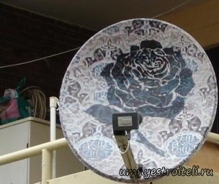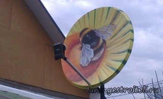 Ещё одна простая фотография спутниковой тарелки, на параболике которой нарисована рыба. Трафарет. Для любителей кино, вообще можно рисовать знаки на антеннах постоянно. Ну и всем любителям футбола: "На спутниковых антеннах можно рисовать мячи в любых цветах, с любыми логотипами". Аэрография на спутниковой антенне. Аэрография конечно же это не трафаретный рисунок, а уж тем более не обычная краска. Аэрография это намного сложнее и престижнее. Срок службы спутниковой антенны на которую нанесли аэрографию, как у автомобильного покрытия с учётом того, что он будет находится под осадками круглый год. А мы все видели, что автомобильная краска, даже после 40 лет эксплуатации, при условии что её нанесли правильно и хорошо, может служить и служить долгие годы. Для окрашивания спутниковой антенны способом аэрография привлекается обученный специалист, по нанесению узоров и всевозможных рисунков. Конечно же чем проще рисунок тем дешевле. Но тут ваша фантазия может разгуляться и из этого может получится кое чего интересного. Пчела сидящая на цветочке и безмятежно собирающая мёд. Сделали такой своеобразный подарок пчеловоду. И спутниковая антенна разрисованная, в такт стены. Ещё пару важных нюансов:Демонтаж и монтаж спутниковой тарелки оплачивается отдельно. Цены на это демократичны, если нужно затратить минимум усилий. При вызове специалиста высотника, оплата его услуг ложится на ваши плечи!!! Так же можно перенастроить каналы спутниковой антенны о чём более подробно в теме «Стоимость установки спутниковой антенны*.» Аэрография на спутниковой антенне.Наш специалист "матёро" красит и делает аэрографию на спутниковой антенне. В разработке**Материал Покраска спутниковой антенны подготовлен администрацией сайта Строительство от а до я. Енакиево-Донецк*. Расскажи друзьям о чём читал!