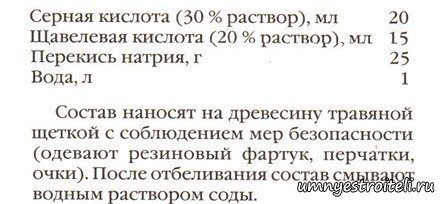 Отбеливание старой древесины.Проводить отбеливание можно на разных жизненных этапах деревянного сооружения или же изделия из неё. Для того чтобы провести отбеливание старой древесины, можно использовать любое имеющее в продаже отбеливающее средства или приготовить их самим. Такие средства делятся как на хлорсодержащие, так и не содержащие хлор. В составе содержащих хлор присутствует хлорная известь, гипохлорит натрия, диоксид хлора и др. Неплохо зарекомендовал себя NEOMID. Отбеливатели, которые не содержат хлор, изготавливаются из аммиака, пероксида водорода, щавелевой кислоты, щелочей и т.п. Хоть отбеливатели по составу разные, но дают одинаковый результат, т.е. окисляют красители и осветляют древесину. umnyestroiteli.ru Средство для отбеливанияВ продаже есть составы, которыми можно сразу работать (обычная белизна, тот же неомид, перекись водорода) и есть такие, которые требуют предварительной подготовки – разбавления, смешивания нескольких компонентов и др,как например показано на фото ниже. Прежде, чем начать отбеливание нужно подготовить поверхность древесины. Стоит удалить различные загрязнения, отшлифовать поверхность наждачной бумагой, RUBанком и при надобности просушить.
