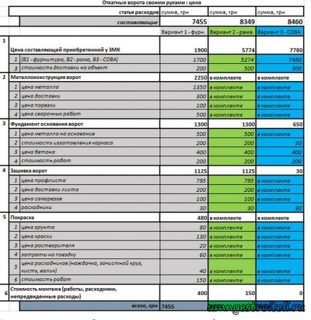 Закажи у нас установку ворот стоимостью всего 30 долларов.Ломаем стереотипы и теперь стоимость установки ворот всего 30 $, что не может не порадовать. До этого, стоимость установки ворот была от 40 долларов. Если вам нужно будет просто установить ворота, к которым идут уже готовые металлические столбики, где потребуется всего лишь вырыть под них ямы, а после залить бетоном, то вот такая работа будет стоить всего лишь 30 универсальных единиц. Если для установки потребуется выкладывать колонны из кирпича, что предусматривает заливку металлических труб, а после кладку кирпича, то за такую установку ворот, придется заплатить специалисту 30 $ плюс - 3-5 UAH (0.5 цента) за кирпич. В одном столбике, в среднем, 120 кирпичей и того получается 60 долларов дополнительно. Вот такая стоимость установки ворот с кирпичными столбиками - 90 долларов. Если вам, захотелось себе установить откаточные ворота (откатные), то простая сборка и установка обойдется в 40 долларов, но не забывайте, что для таких ворот понадобится фундамент и дополнительный монтаж. Фундамент для откатных ворот стоить будет, примерно, 50 долларов, расходник для крепления листов профнастила в 3 доллара, и к сожалению доставка ворот не бесплатна и стоить она будет также в районе 30 долларов, что лично мне не очень нравится. Ну занимаетесь изготовлением ворот в городе, так сделайте доставку бесплатную, а в другой город там, уже платно, хотя изготовлением ворот, наверное в каждом городе кто-либо занимается. Как обычно прикладываю таблицу, из которой вы более подробно можете узнать про установку и работы проделанные специалистами, прежде чем они попадут к вам. Расскажи друзьям о чём читал!