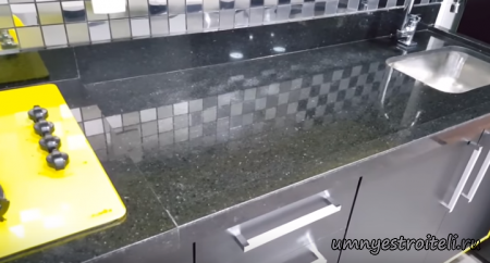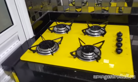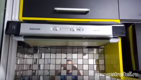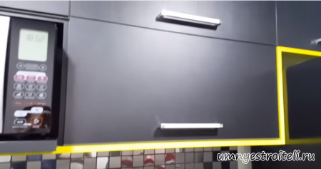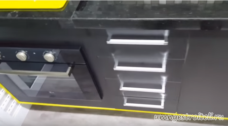 На видео, которое предоставил Александр Пашнюк, можно сказать обзор конкретной взятой кухонной мебели. Ничего в ней супер необычного нет, кроме того что газовая плита желтого цвета и по мебели проходит желтый кант.