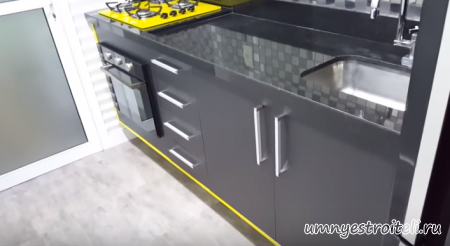От автора: В маленькой смарт-квартире элегантная кухня. На черных и серых поверхностях веселит желтый цвет варочной поверхности и тонкая окантовка мебели Расскажи друзьям о чём читал!